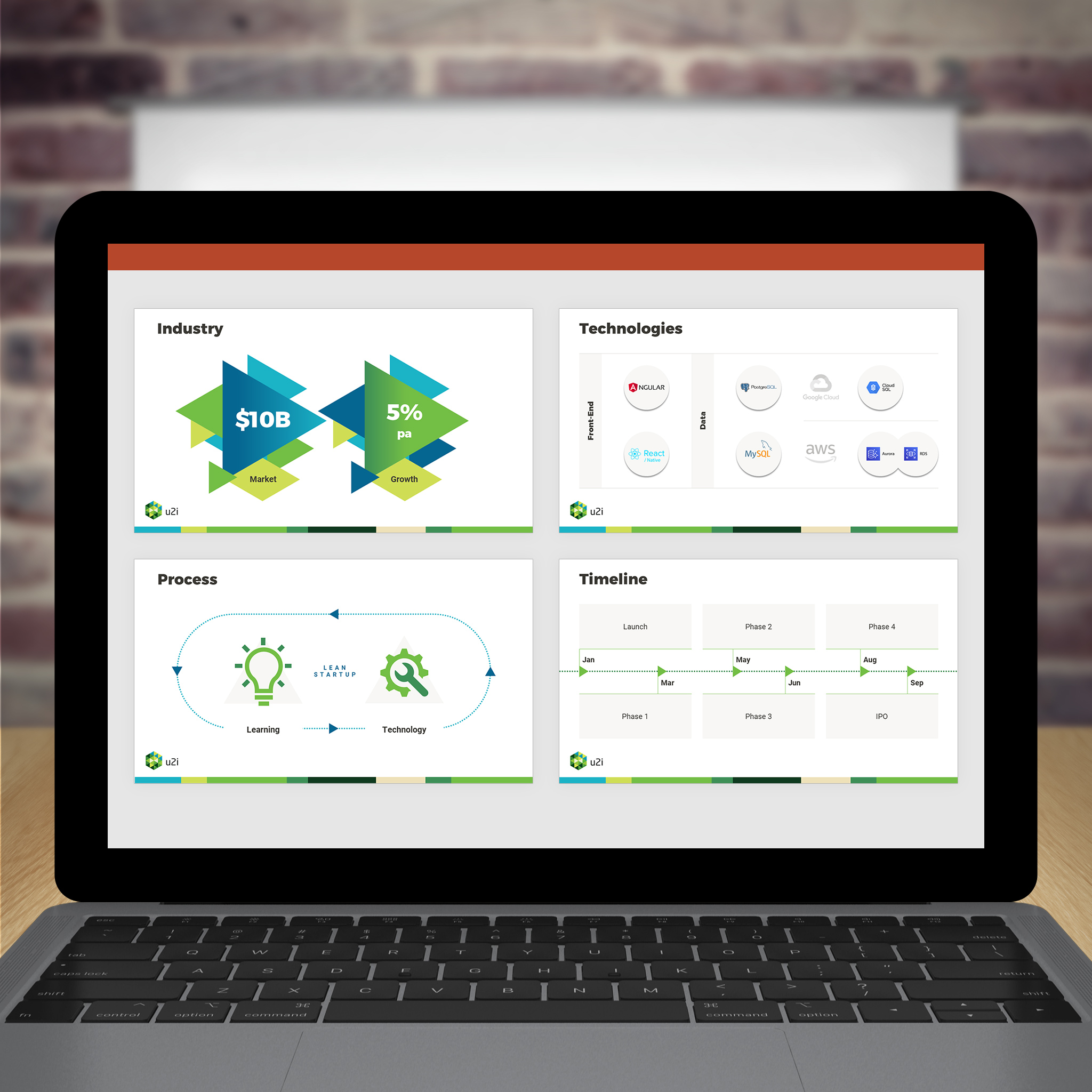 This presentation focused on a series of diagrams drawn in the brand style, each of which illustrated a complex point that the speaker would elaborate on. The presentation was intended for investors, but could also be adapted for clients.