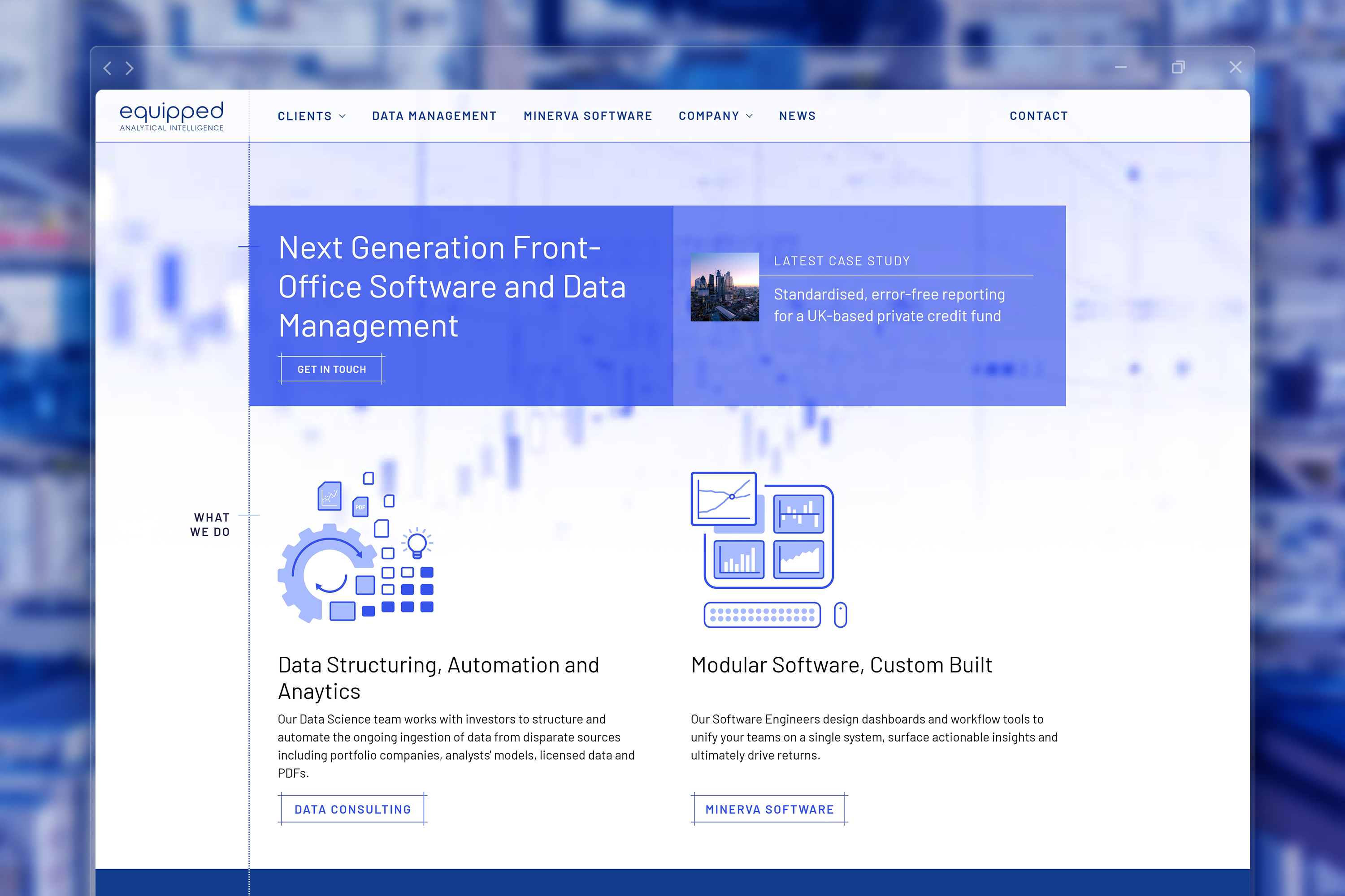 We designed and built a brand new website for Equipped, being the first embodiment of a refreshed brand that we developed. The design emphasises the sophistication of their technology that helps alternative investors manage their portfolios. The design incorporates a subtle motion and animation.