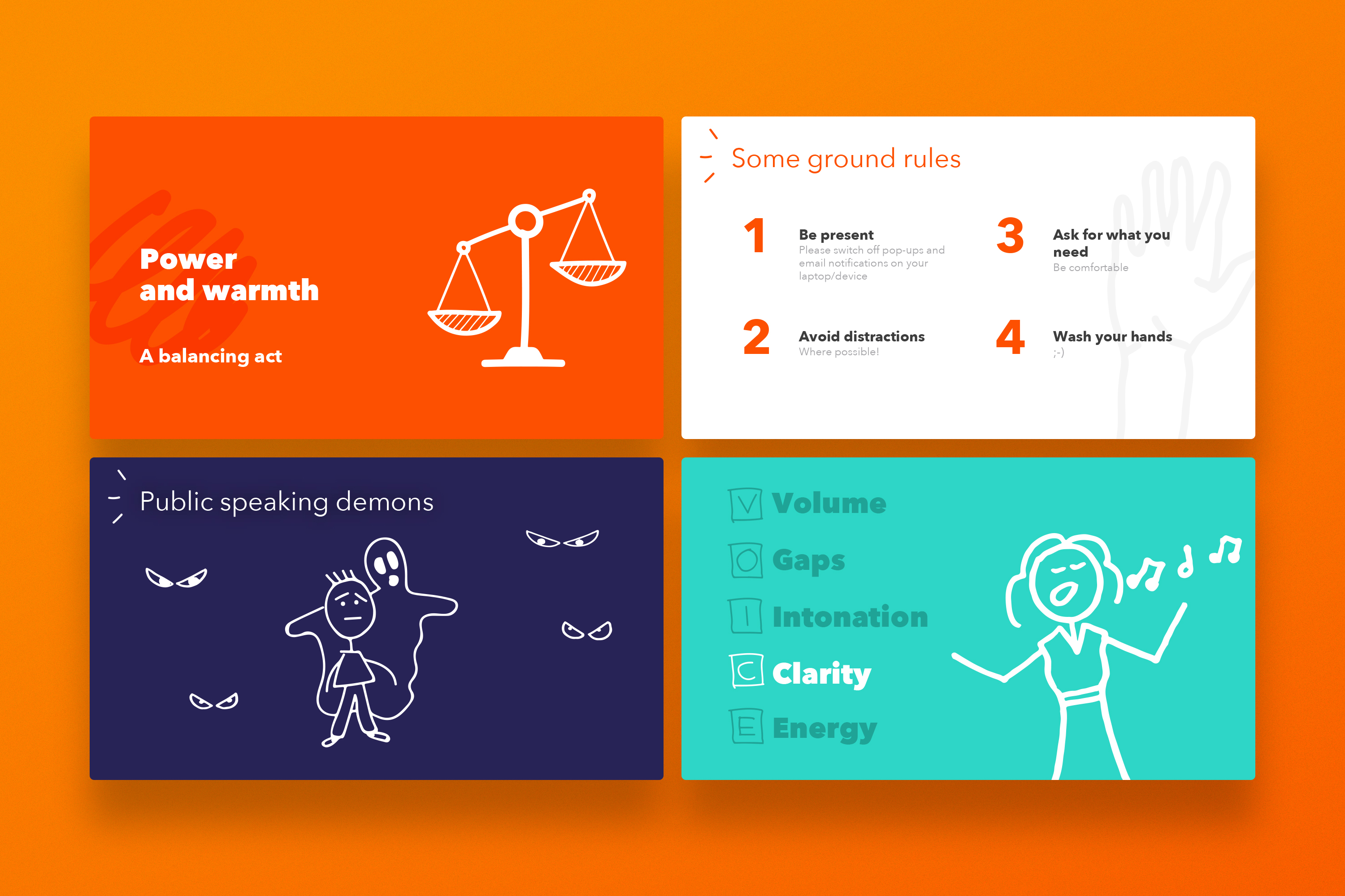We produced a new template and then applied it immediately to the slides for their next session, staying faithful to their brand and content. Ginger are the experts, but public speaking can be scary: so both authority and friendliness had to come across in the design.