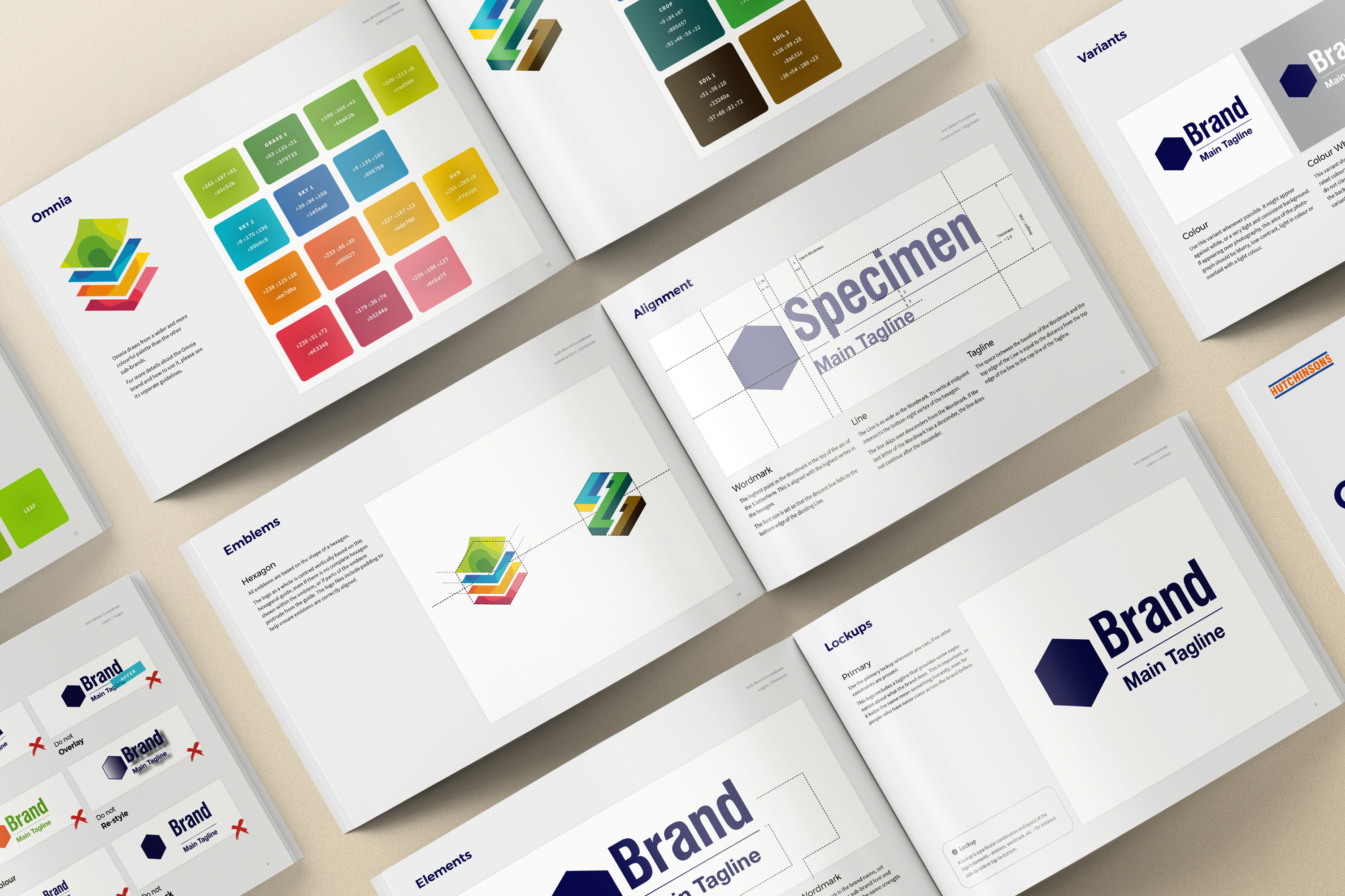 We developed a logo system, and suite of logos, covering different facets of Hutchinson’s business. Each logo follows a consistent hexagonal grid structure that’s present within their main visual identity.