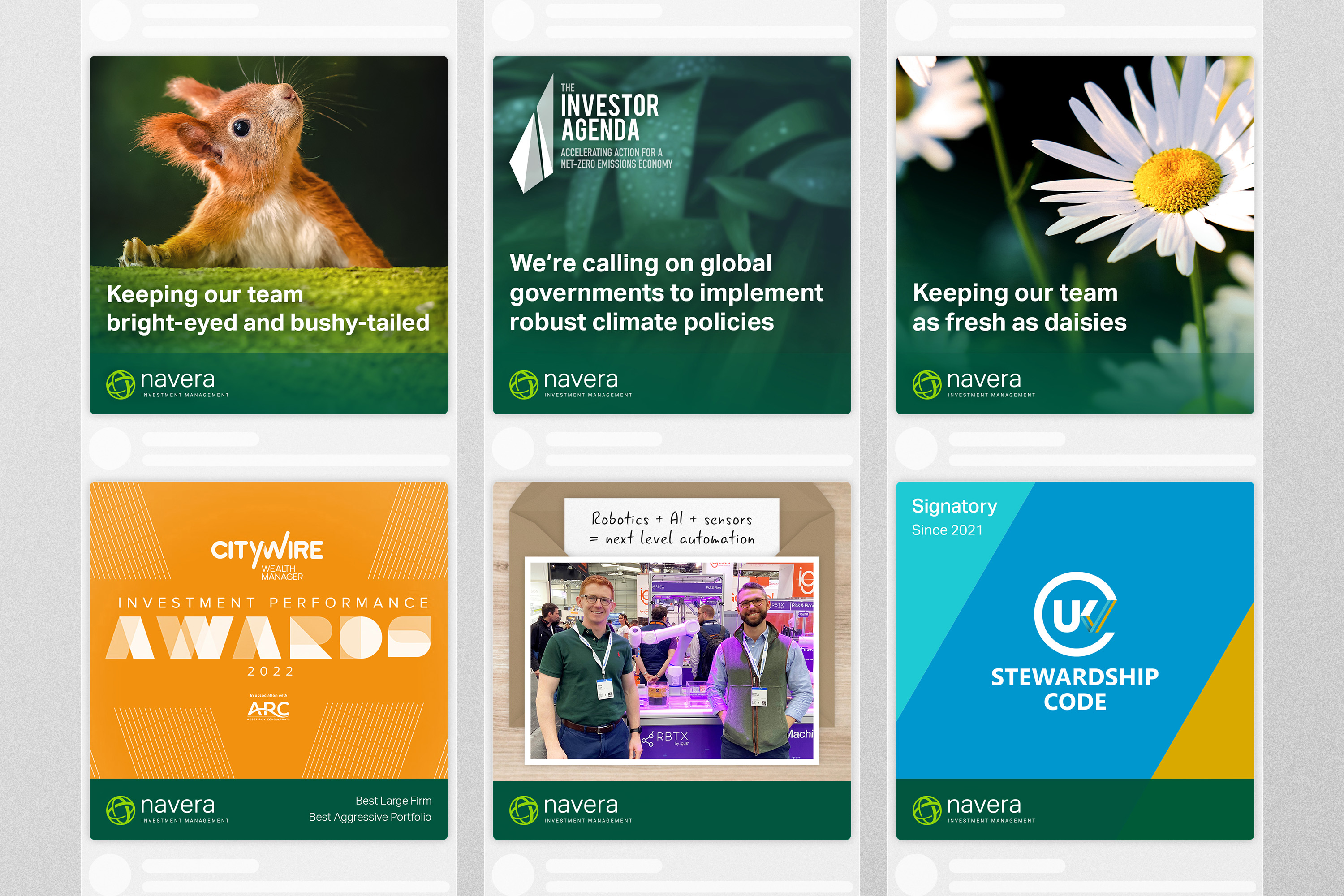 Navera maintain a LinkedIn account for which we prepare graphics to accompany their posts. This isn’t an emojis kind of brand: we ensure the graphics reflect their professional and people-focused tone.