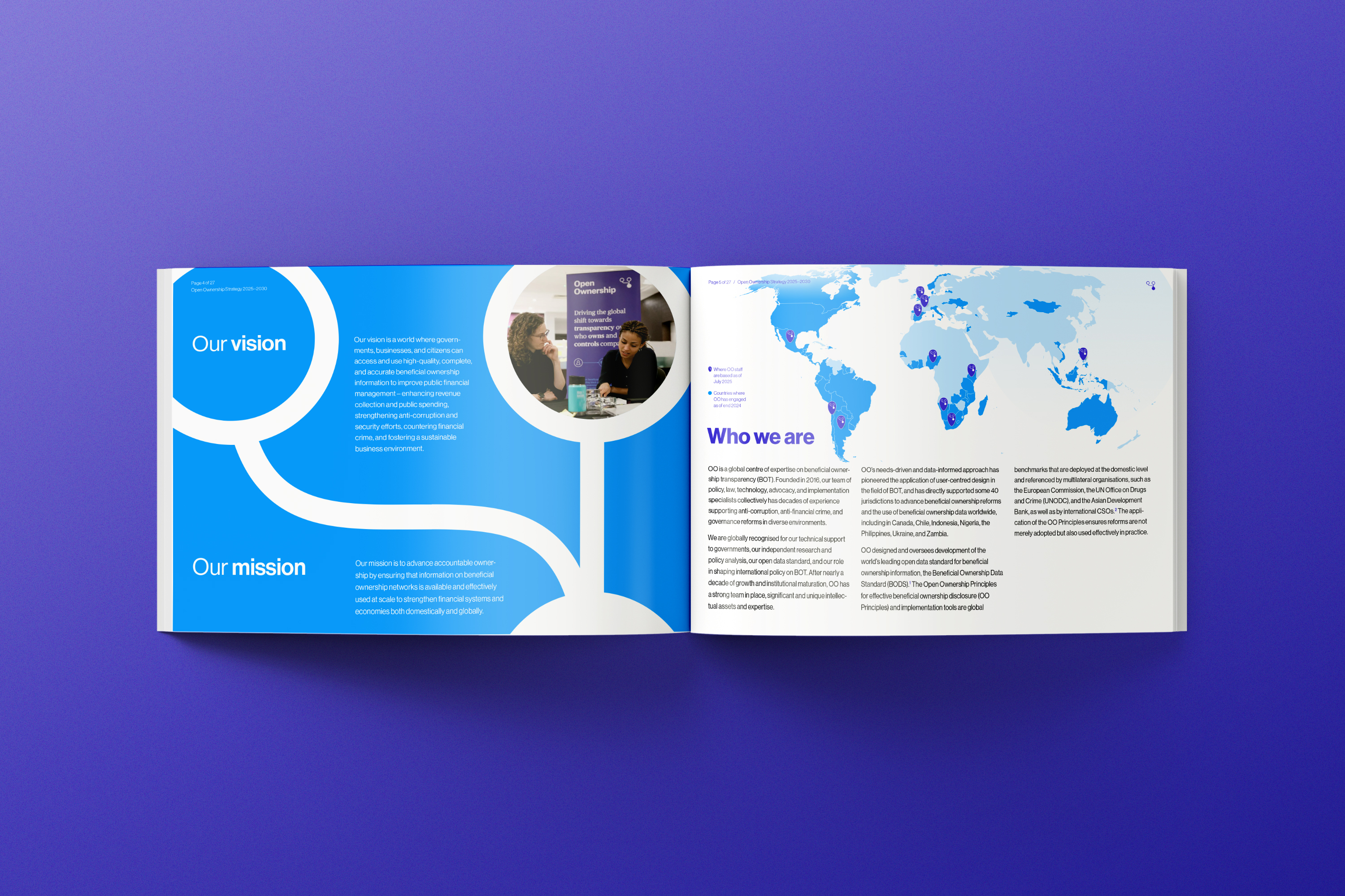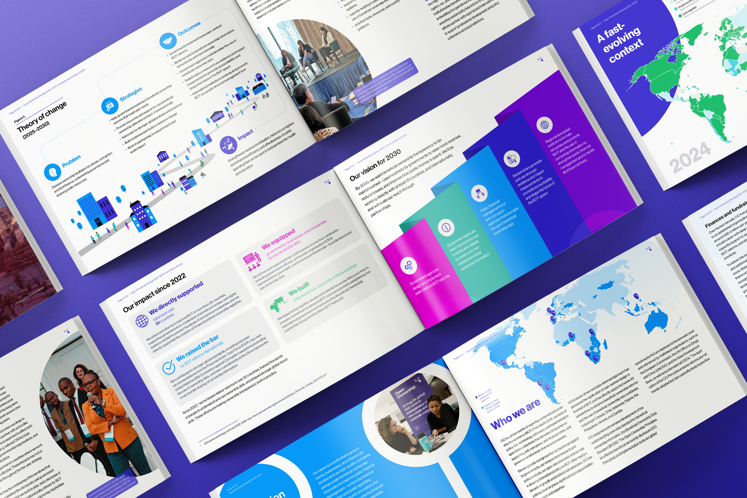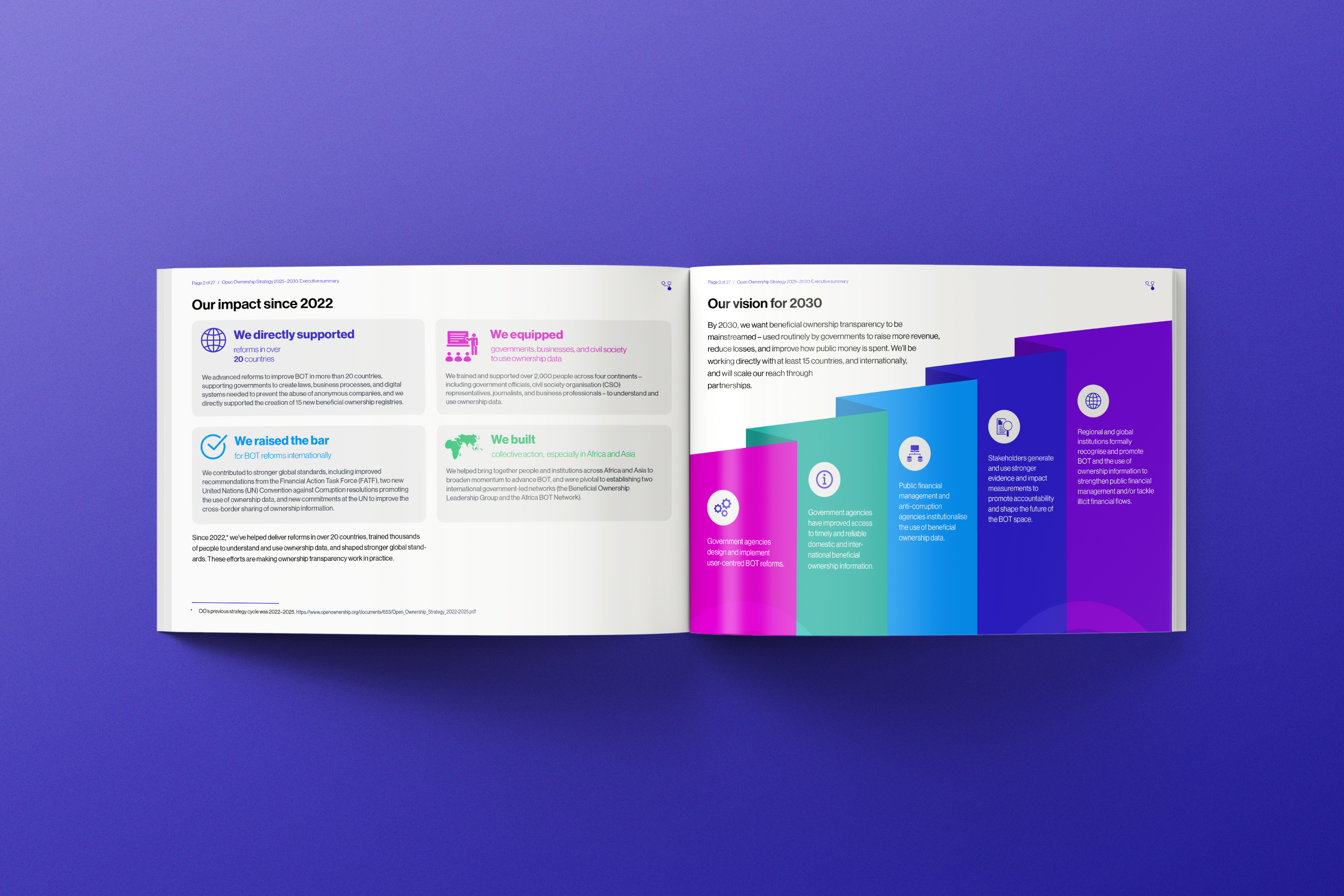 Open Ownership set out a bold 5-year vision and it deserved to be presented just as boldly. With every page, we considered how to get the point across clearly, visualise data points, and make the ideas come to life. Many of the infographics were also desiged for repurposing as social media posts, allowing Open Ownership to spread the word across multiple channels.