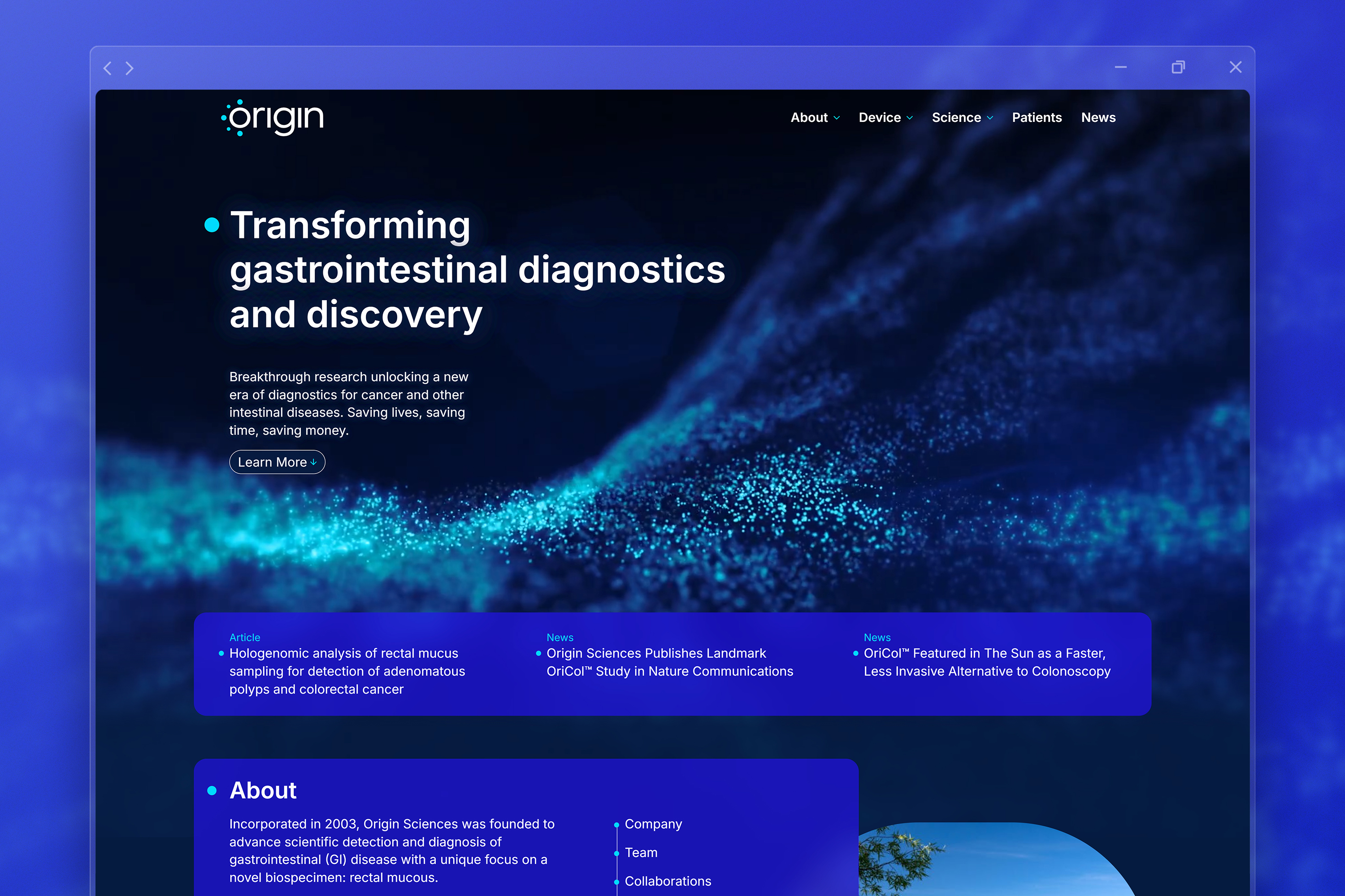 We designed and built the website for Origin Sciences, whose medical research heralds a breakthrough for gastrointestinal diagnostics. The design is forward-thinking, and the sense of medical technology is offset by the warmth of natural photography.