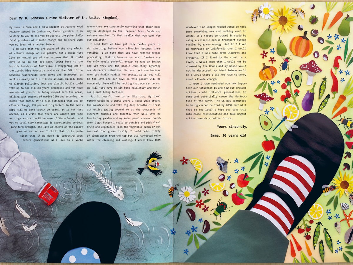 While primarily functioning to catch the eyes of passing students, and provide an appealing first impression, the cover design is also deeply symbolic. Each individual’s contribution to sustainability may be a drop in the ocean, but – as quoted from Mother Teresa on the inside cover – “the ocean would be less because of that missing drop.”
